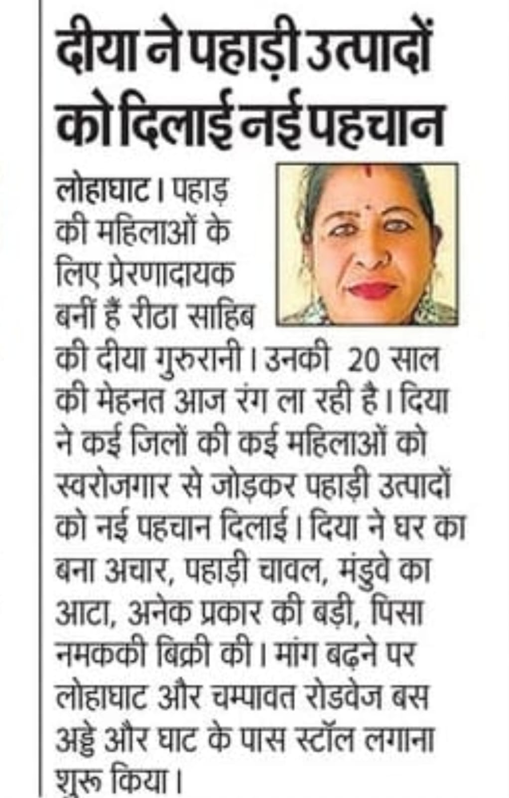 वर्ष 2005 में चंपावत के रीठा साहिब में रहने वाली दिया देवी ने पढ़ाई के साथ आत्मनिर्भर बनने की दिशा में कदम बढ़ाया। वर्ष 2014 में एएम करने के बाद बीएड किया। इसी दौरान उन्होंने एक एनजीओ से जुड़कर काम शुरू किया। इस मंच के माध्यम से उन्होंने चंपावत के साथ-साथ अल्मोड़ा, पिथौरागढ, पौढी गढवाल आदि जगहों की कई महिलाओं को भी रोजगार से जोड़ने का काम किया। लगातार काम और अनुभव के बाद करीब चार साल पहले दिया देवी ने खुद का पहाड़ी उत्पादों का कारोबार शुरू किया। जिसमें घर का बना अचार, पहाड़ी चावल, मंडुवे का आटा, अलग-अलग प्रकार की बड़ी, विभिन्न प्रकार के पहाड़ी पीसा नूण और अन्य पारंपरिक उत्पाद शामिल हैं। जैसे-जैसे लोगों की मांग बढ़ती गई, उन्होंने लोहाघाट और चम्पावत रोडवेज बस अड्डे और पिथौरागढ़ राष्ट्रीय राजमार्ग पर घाट के पास स्टॉल लगाना शुरू कर दिया। अब वह लोगों के ऑर्डर के अनुसार पहाड़ी उत्पाद लाती हैं और उन्हें बेचकर फिर अपने गांव रीठा साहिब लौट जाती हैं। दिया देवी की इस यात्रा में सबसे खास बात यह है कि शुरुआत में उन्हें न आर्थिक मदद मिली और न ही किसी सरकारी योजना का सहारा। इसके बावजूद उन्होंने हार नहीं मानी। अपने काम के साथ उन्होंने गांव की कई महिलाओं को भी जोड़ा और उन्हें घर बैठे रोजगार का अवसर दिया। आज कई महिलाएं उनके साथ काम कर अपनी आय अर्जित कर आत्मनिर्भर बन रही हैं। हालांकि प्रशासन से उन्हें कोई सीधी आर्थिक सहायता नहीं मिली, लेकिन डीएम मनीष कुमार ने कई बार उनके प्रयासों की सराहना की, जिससे उनका मनोबल बढ़ा। दिया ने कहा कि मेहनत के दम पर कोई भी महिला स्वरोजगार कर अपने परिवार का आसानी से भरण-पोषण कर सकती है।